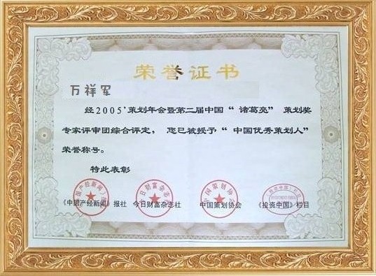 2005年万祥军被"诸葛亮"策划奖评审评定为"中国优秀策划人"